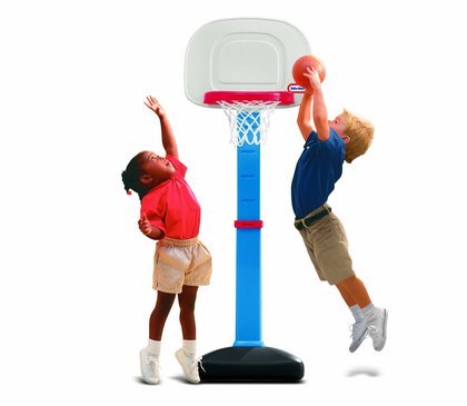 18 months - 5 years. This basketball set from Little Tikes grows as fast as toddlers by adjusting to six heights from 2 1/2 to 4 feet. Includes an oversize rim and a junior size basketball. Base must be weighted with sand (not included). 22"L x 23 3/4"W x 60"H.RelateItems